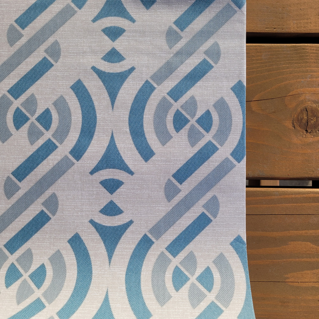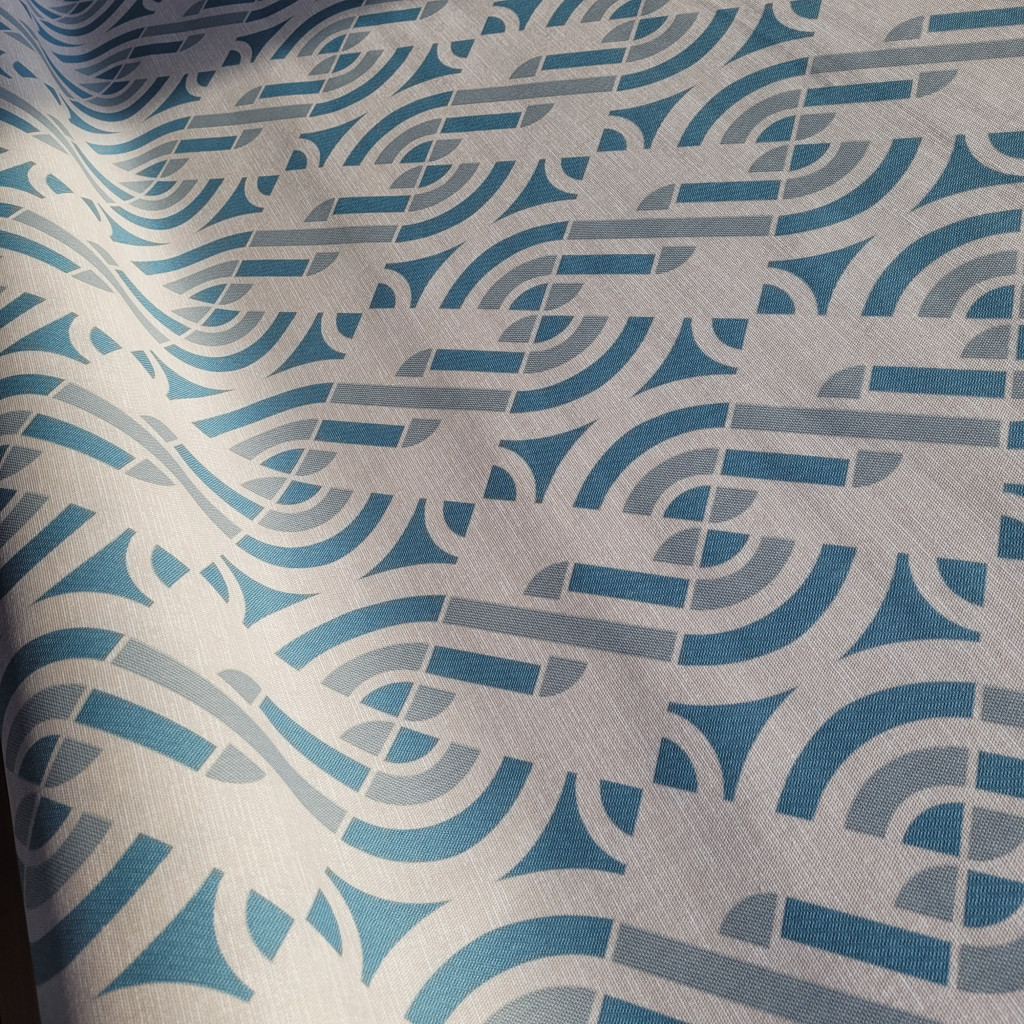 Ez a kek geometria mintájú impregnált textil terítő ritka ötvözete a valódi textil