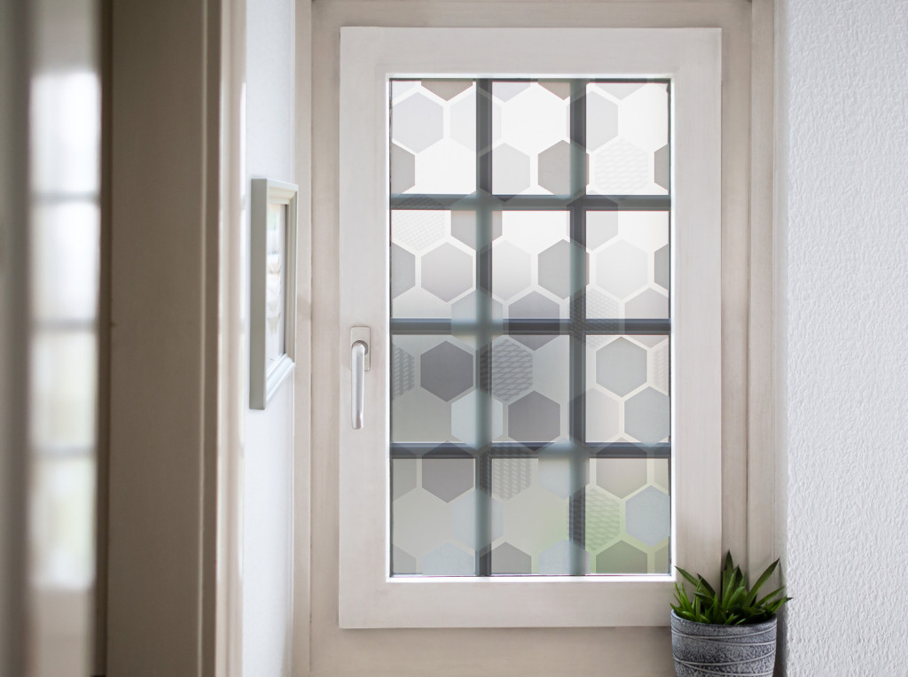 Statikus üvegfólia hatszög mintával, ragasztómentes kivitelben.